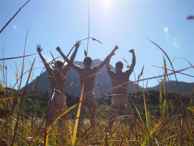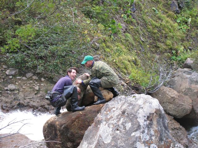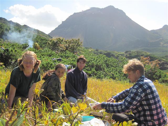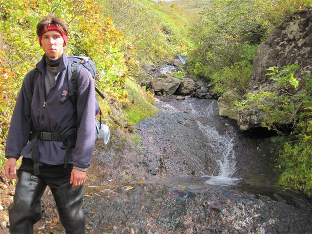Но, либо до него не дошли, либо его там уже нету. Попался пенный водопадик, как будто кто-то порошка стирального насыпал. Пузыри по 30 см диаметром! На обратном пути ничего не предвещало дождя. Но он все таки пошел. А у нас некоторые вещи на улице сохли. Пришлось совершить небольшой марш-бросок под дождичком. Саня даже пожалел, что у него не было автомата... Вымокшие вещи сушили на костре, т.к. на следующий день планировалось возвращение в цивилизацию и высушить их никак не получится. Утром, в четверг, позавтракали, собрались и снова в путь, но уже домой. Нам предстояло добраться до перевала, откуда берет начало ручей Трущебный, впадающий в реку Благодатная возле Горячих Ключей. По прямой это 10 км. А шли практически весь световой день.