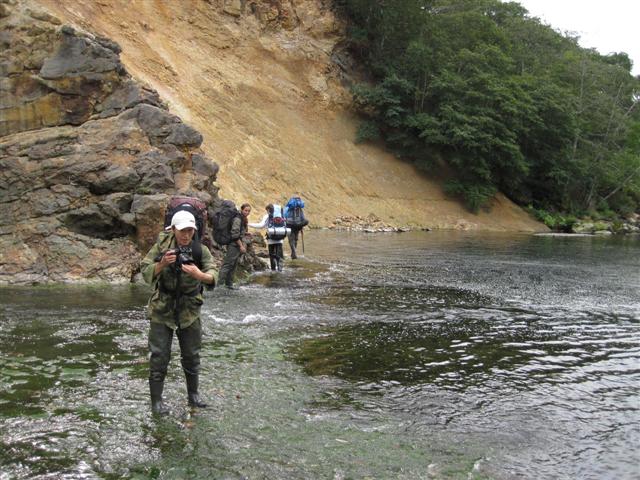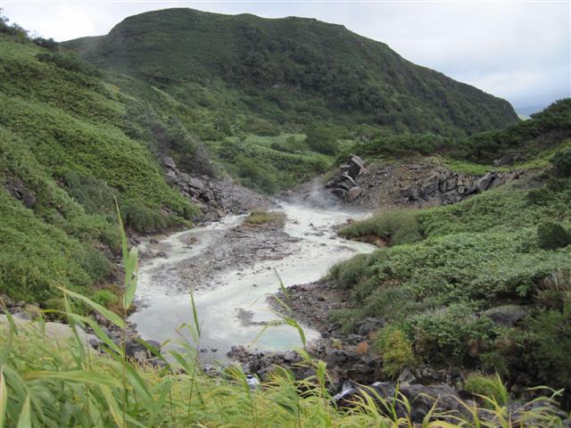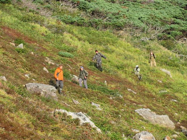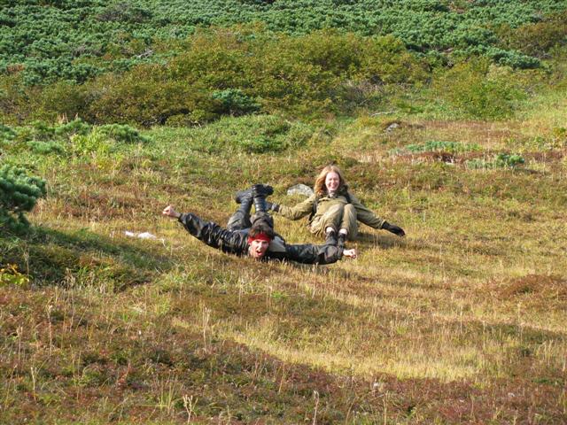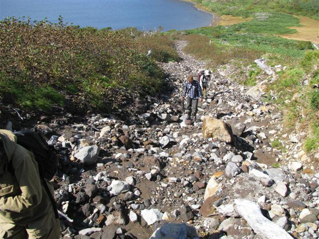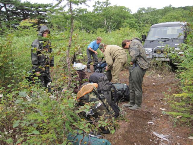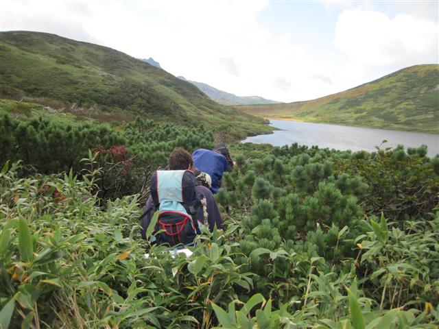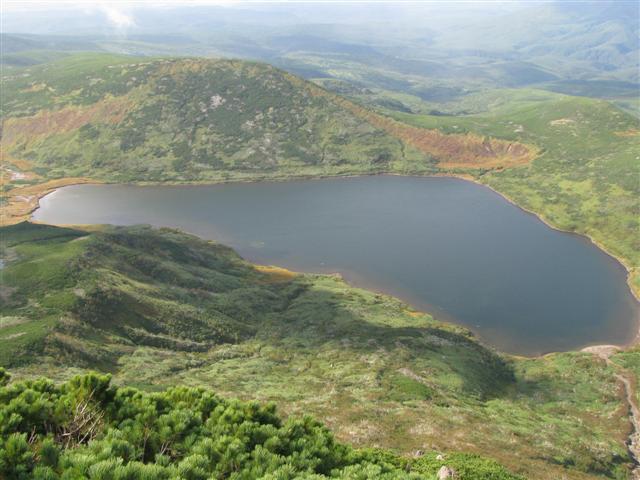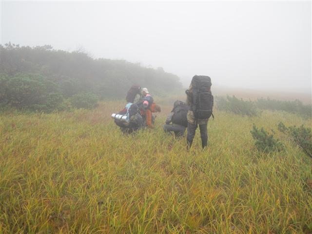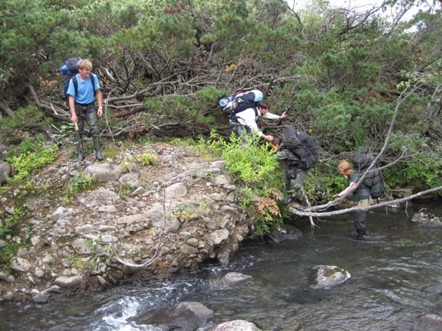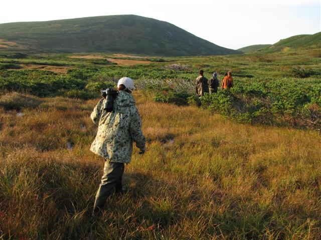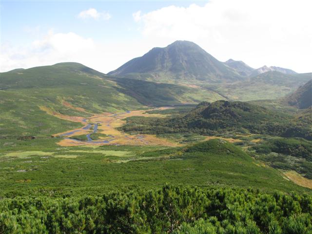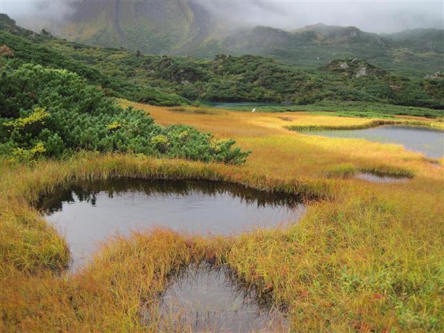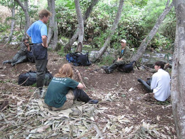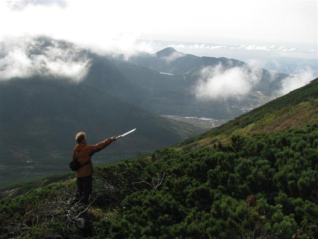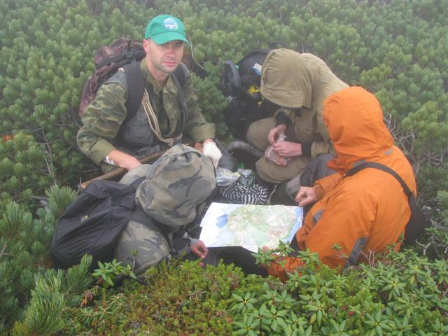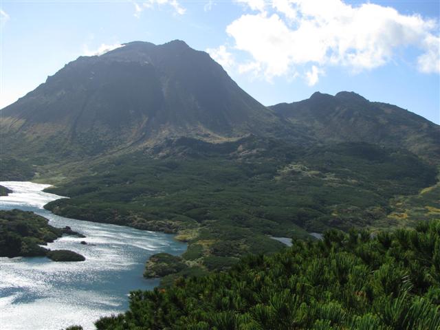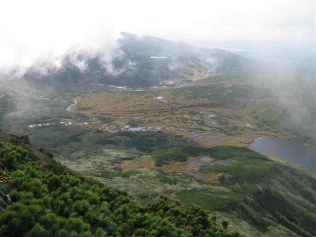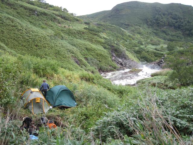 В болоте ручья Многоозерного очень много клюквы. Прям промышленные масштабы. Можно поставить домик клюковика и организовывать экспедиции за клюквой, а вывозить вертолетом... Но мелковатая она, на болоте в Курильске крупнее. Лагерь поставили на полянке возле озера Лопастного, немного в стланичке, надеясь, что он будет защищать палатки от ветра. Напрасно надеялись - хлестало и шатало палатки так, что иногда казалось поломает или унесет вместе с обитателями. Но ничего - выдержали испытание. Кушать готовили на костре, который разжигали горелкой. Полезная вещь, газовая горелка! Если бы не она, то с костром приходилось бы мучатся не по туристски - дрова абсолютно мокрые, да еще и свежак. Ничем традиционным (бумага, порох) легко не разожжешь. Утром погодка не очень благоприятствовала. Но поближе к полудню разошлась. Юрка с Саней пошли продолжать рубить тропку через сопочку, чтоб полегче было на другую сторону озера перебраться. А остальные пошли туда же, любоваться окрестностями. Это была среда и в этот день Итуруп должен был посетить президент всея Руси! Как выяснилось позже - не посетил.