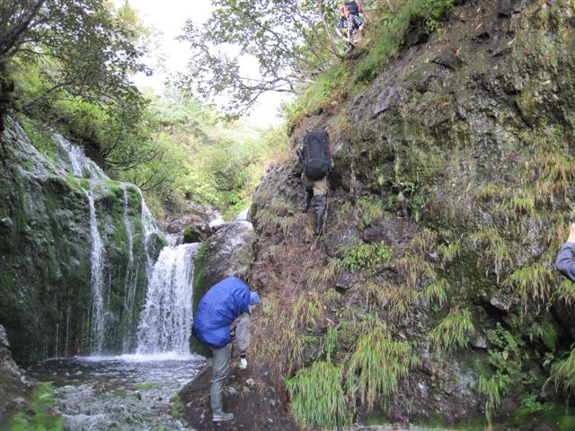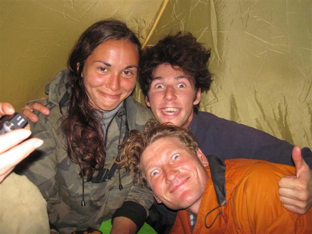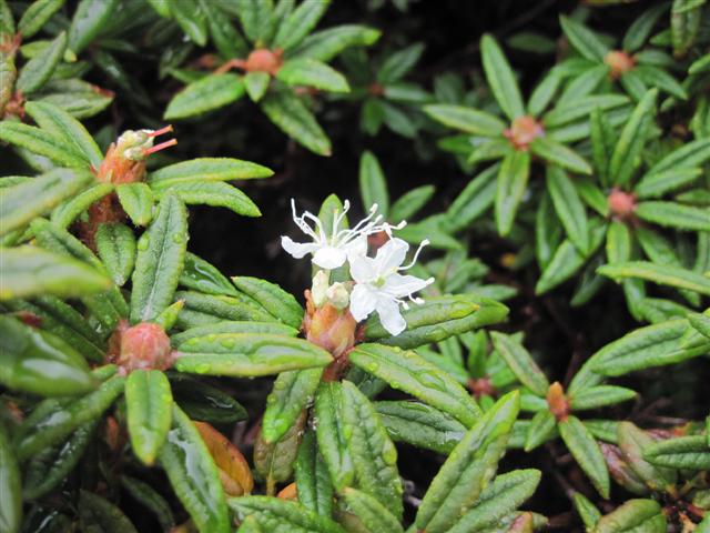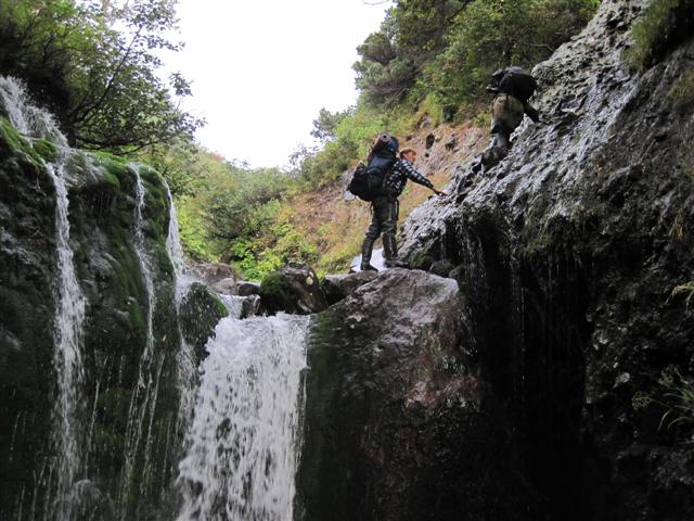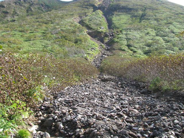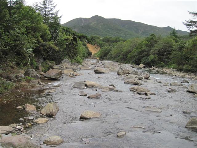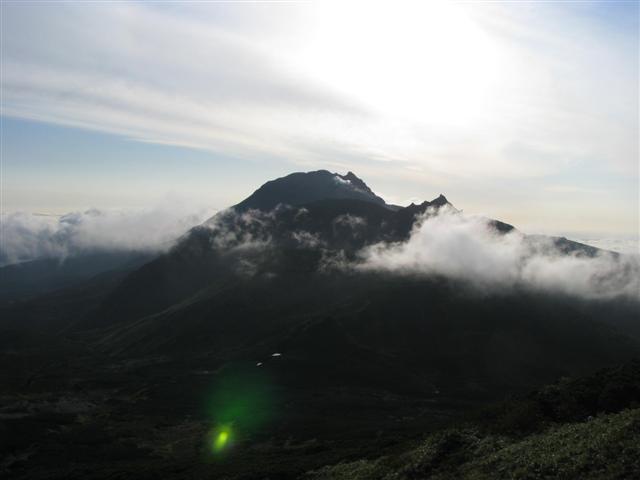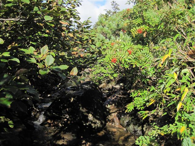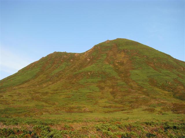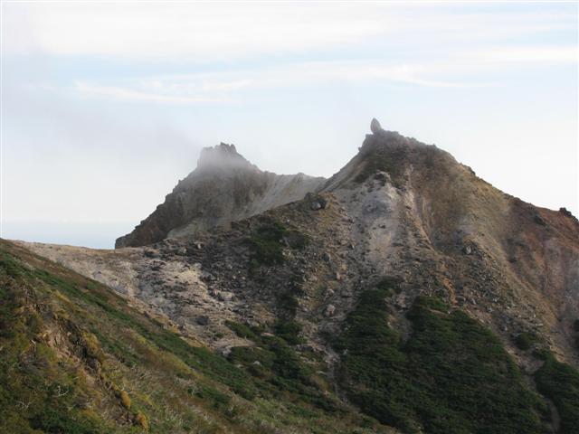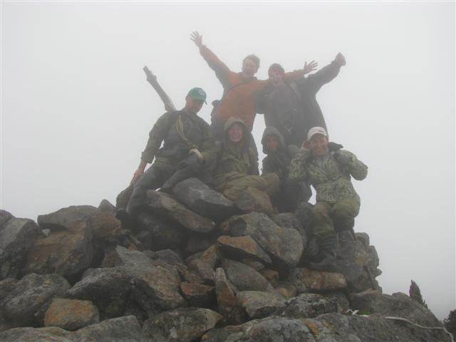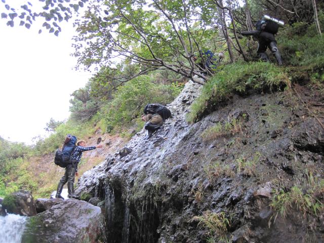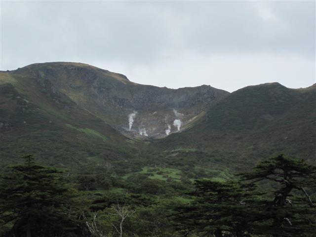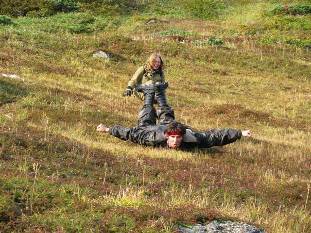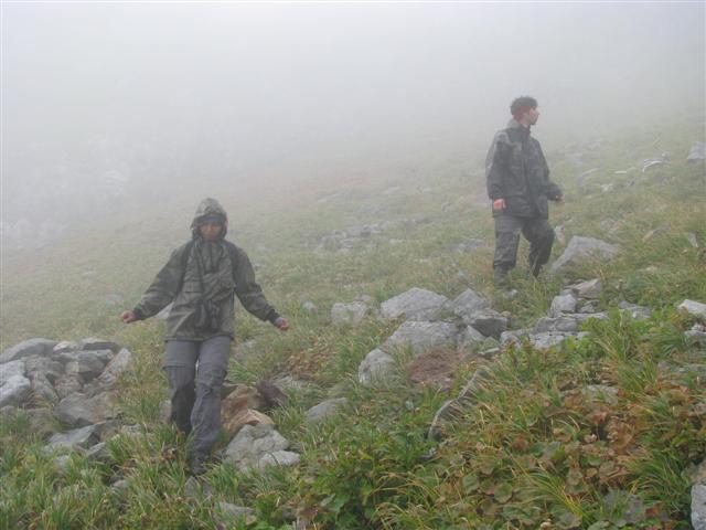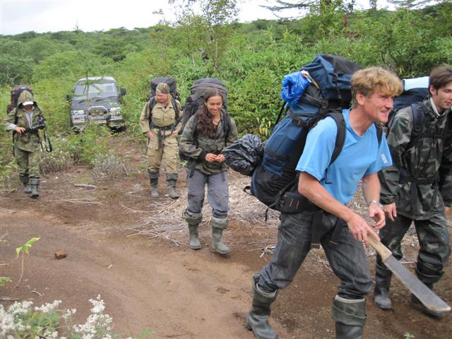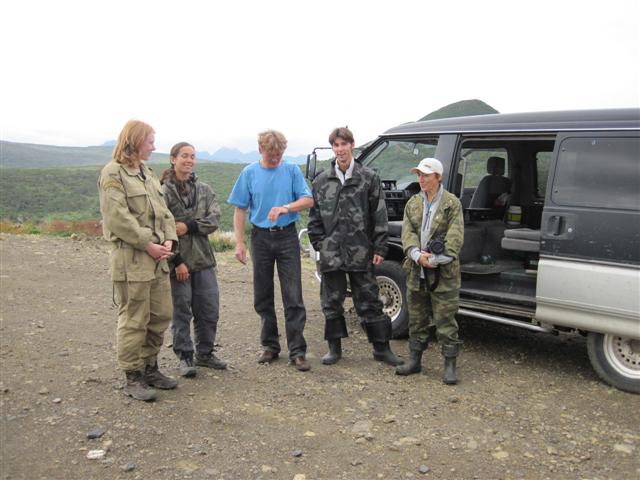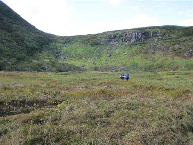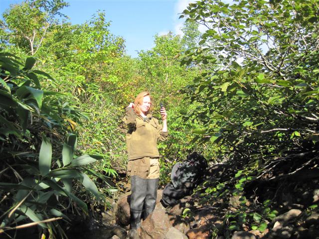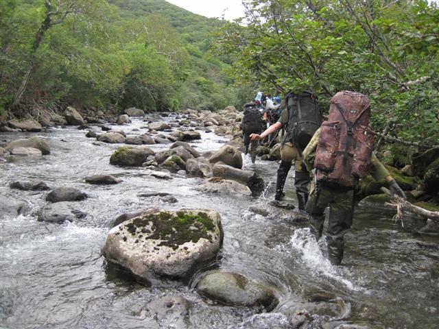 В болоте ручья Многоозерного очень много клюквы. Прям промышленные масштабы. Можно поставить домик клюковика и организовывать экспедиции за клюквой, а вывозить вертолетом... Но мелковатая она, на болоте в Курильске крупнее. Лагерь поставили на полянке возле озера Лопастного, немного в стланичке, надеясь, что он будет защищать палатки от ветра. Напрасно надеялись - хлестало и шатало палатки так, что иногда казалось поломает или унесет вместе с обитателями. Но ничего - выдержали испытание. Кушать готовили на костре, который разжигали горелкой. Полезная вещь, газовая горелка! Если бы не она, то с костром приходилось бы мучатся не по туристски - дрова абсолютно мокрые, да еще и свежак. Ничем традиционным (бумага, порох) легко не разожжешь. Утром погодка не очень благоприятствовала. Но поближе к полудню разошлась. Юрка с Саней пошли продолжать рубить тропку через сопочку, чтоб полегче было на другую сторону озера перебраться. А остальные пошли туда же, любоваться окрестностями. Это была среда и в этот день Итуруп должен был посетить президент всея Руси! Как выяснилось позже - не посетил.