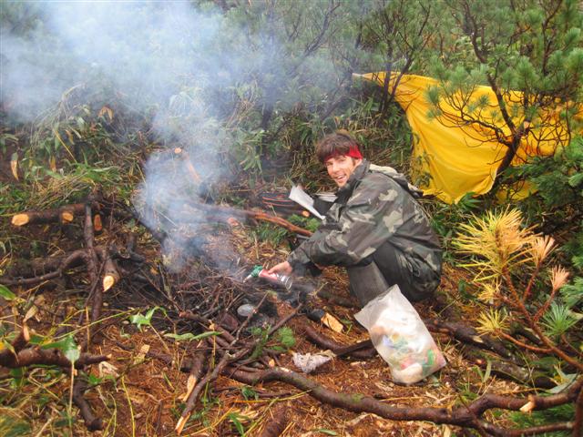В болоте ручья Многоозерного очень много клюквы. Прям промышленные масштабы. Можно поставить домик клюковика и организовывать экспедиции за клюквой, а вывозить вертолетом... Но мелковатая она, на болоте в Курильске крупнее. Лагерь поставили на полянке возле озера Лопастного, немного в стланичке, надеясь, что он будет защищать палатки от ветра. Напрасно надеялись - хлестало и шатало палатки так, что иногда казалось поломает или унесет вместе с обитателями. Но ничего - выдержали испытание. Кушать готовили на костре, который разжигали горелкой. Полезная вещь, газовая горелка! Если бы не она, то с костром приходилось бы мучатся не по туристски - дрова абсолютно мокрые, да еще и свежак. Ничем традиционным (бумага, порох) легко не разожжешь. Утром погодка не очень благоприятствовала. Но поближе к полудню разошлась. Юрка с Саней пошли продолжать рубить тропку через сопочку, чтоб полегче было на другую сторону озера перебраться. А остальные пошли туда же, любоваться окрестностями. Это была среда и в этот день Итуруп должен был посетить президент всея Руси! Как выяснилось позже - не посетил.