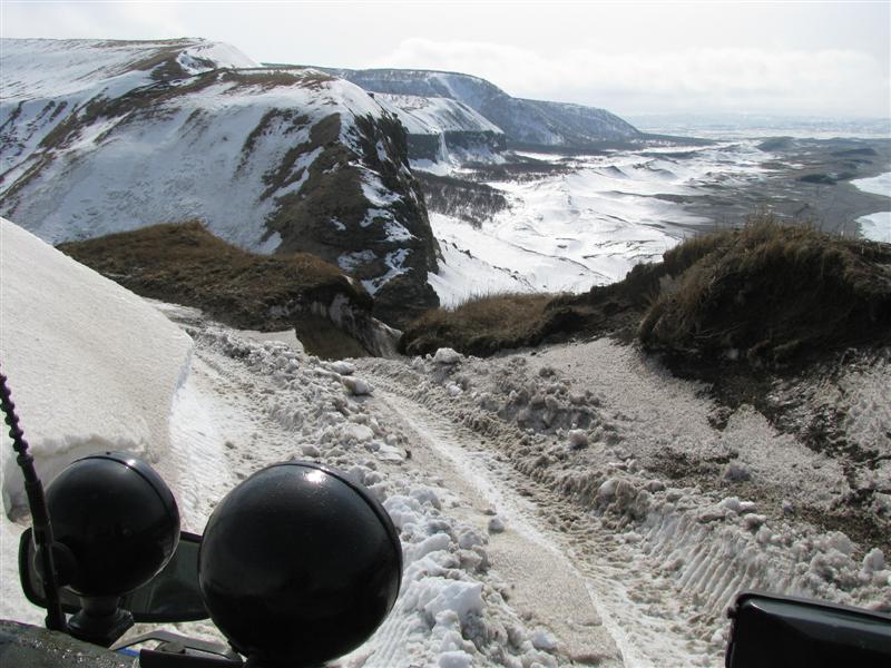 Не заглох и в лед не уперся ;-). Залез на пемзу - на 4 и 5 фото на переднем плане видны пемзовые камушки. Вот на один из них, но большой (его видно, если посмотреть повнимательнее перед мотобылой), и наехали - висит, гусянки крутятся (лапками трепыхает), а двигаться не может. Водила уголки на гусянки прикрутил (иногда и волна захлестывала - но в салоне еще люди сидели, которые не смогли через окно вылезти на броню), да еще и ГТСка - стянули. Часа два потом вода сливалась.